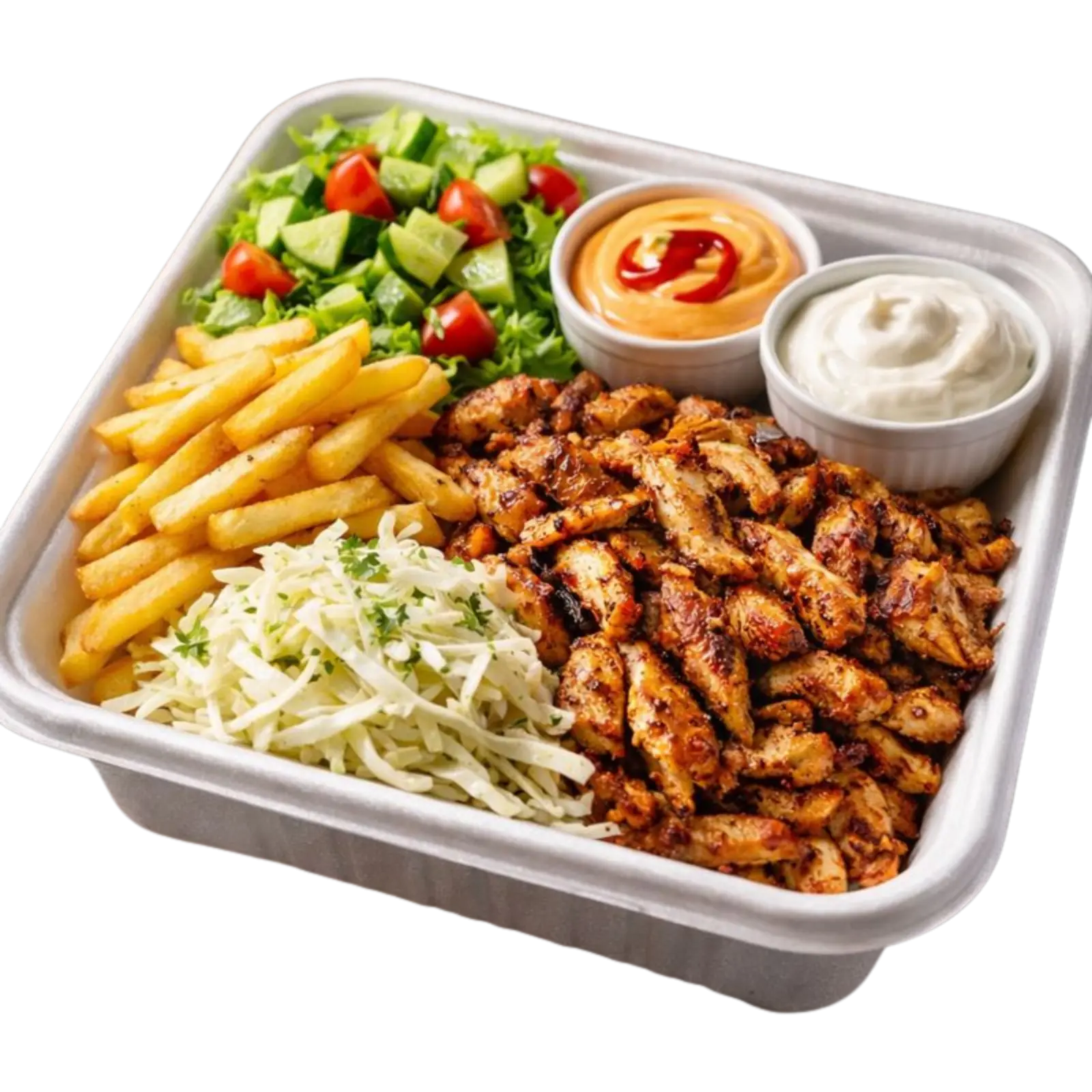 Lebanese style juicy and grilled chicken shawarma platter, with pita bread, fries, salads and sauces of choice