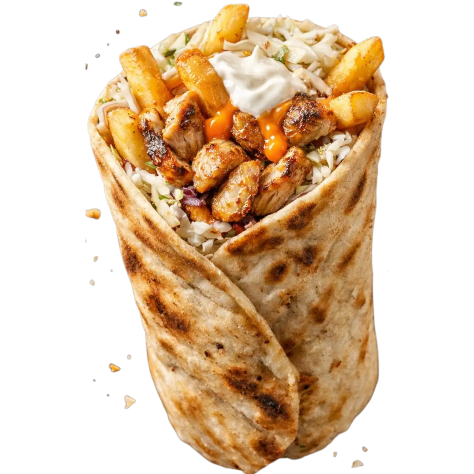 Marinaded and grilled juicy chicken shawarma, wrapped in pita bread, along with fries, cabbage salad and our homemade sauces